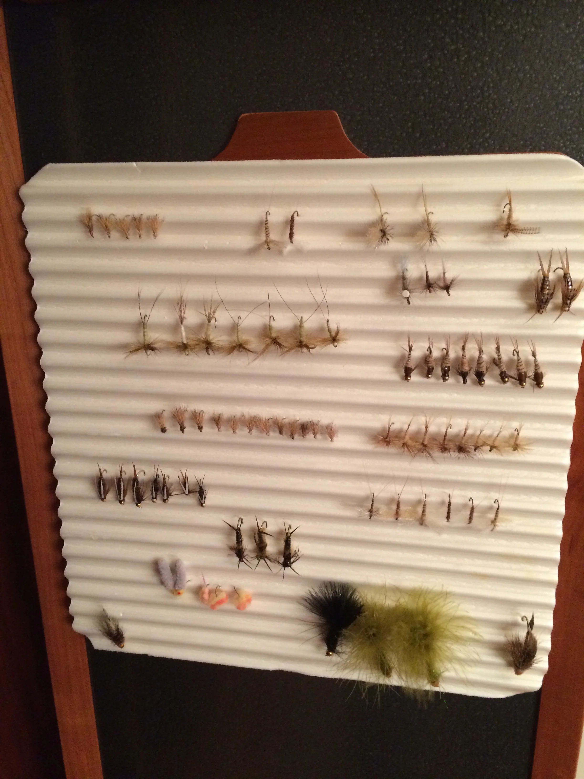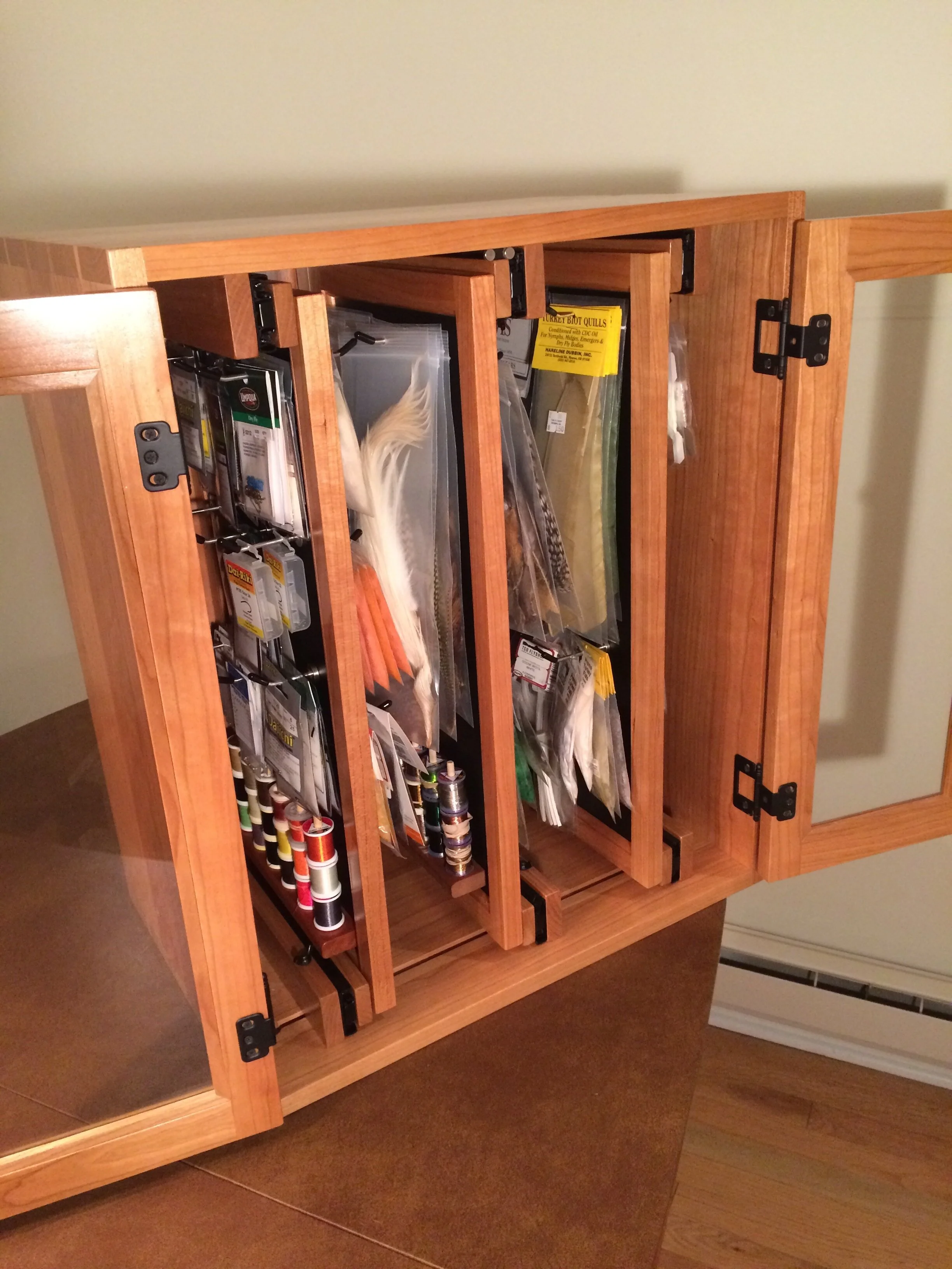 The FlyTy(TM) storage system was designed to provide high capacity, flexibility, and visibility for materials used in fly tying. It consists of pull-out, rotating panels that accept magnetic fixtures that hold the material. The material can be organized in any way that suits the user. It can be easily rearranged if necessary.